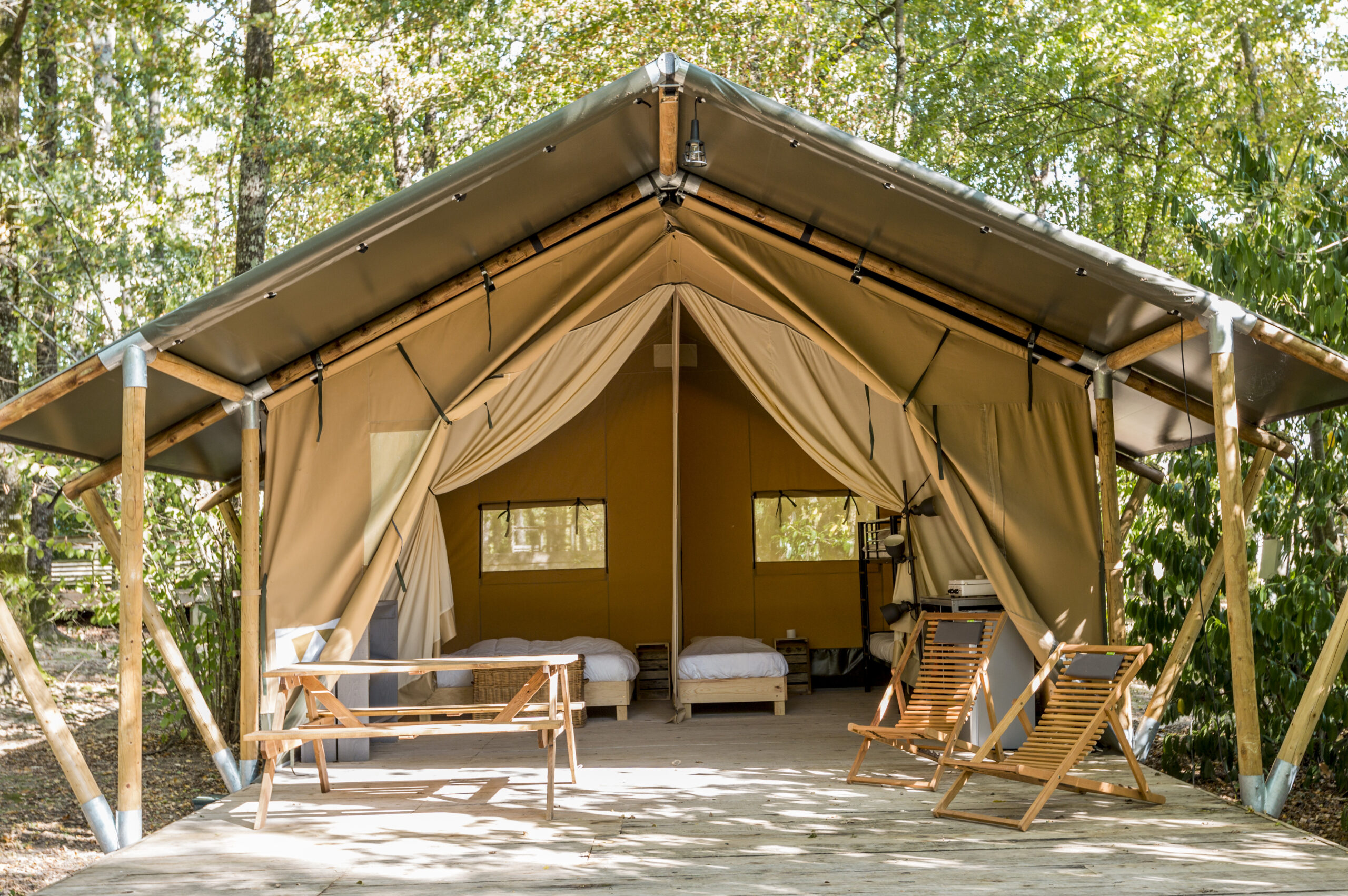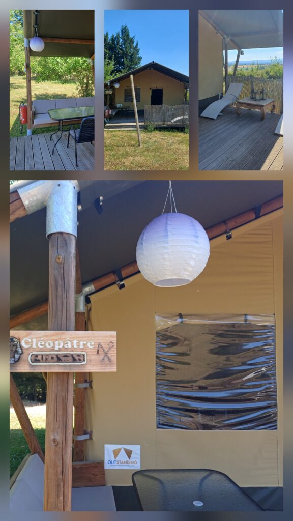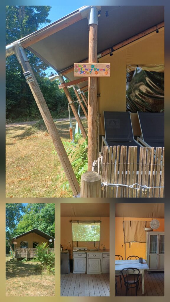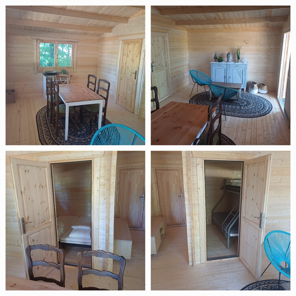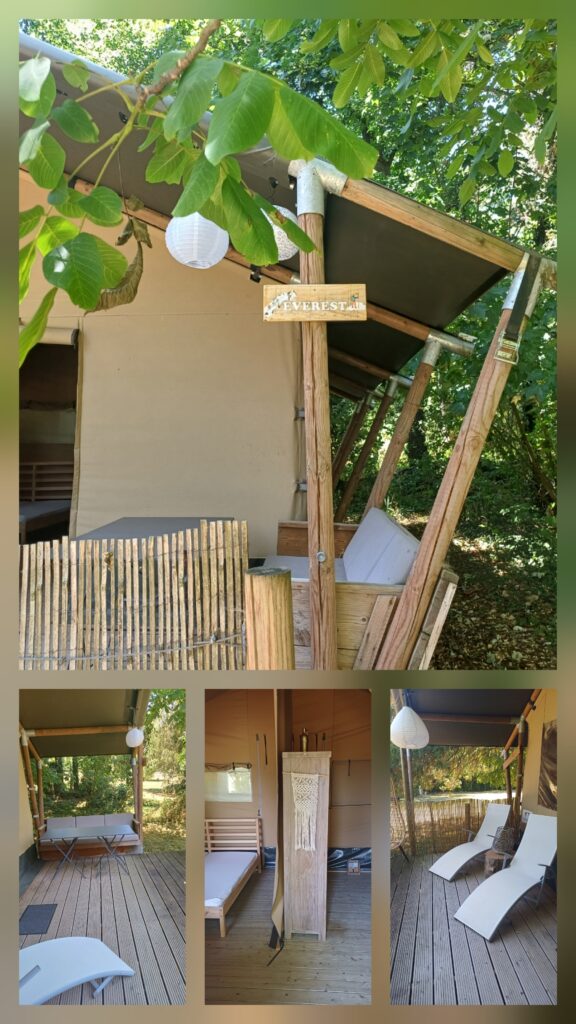 Pour la saison d’été 2025, nous avons décidé d’installer un nouveau chalet bois à la place d’une tente Bell. Ce chalet est composé de 2 chambres et pourra accueillir confortablement 5 personnes (1 grand lit double de 160 ainsi qu’un lit superposé de 140 avec un lit simple). Il aura tout le confort pour répondre aux plus hauts standards du glamping : sanitaires privatifs (douche et Wc séparés), coin cuisine, salle à manger, terrasse privative et grand terrain à l’ombre des arbres.